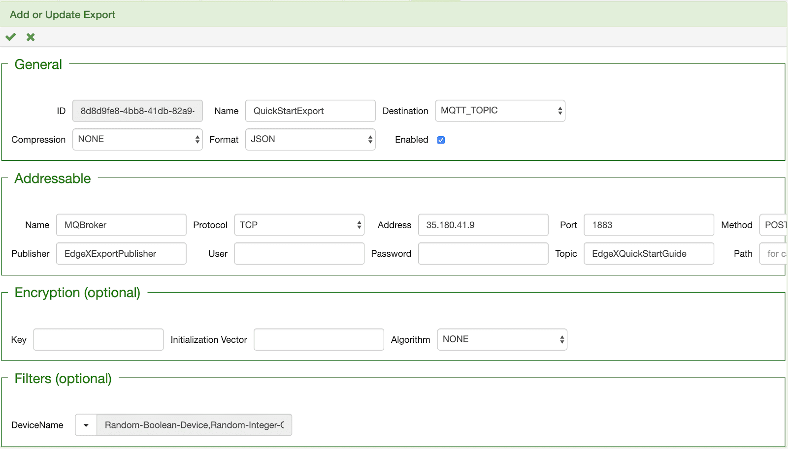 有了云端MQTT服务器,还需要在树莓派4网关和服务器之间建立一个northbound连接。EdgeX 导出服务(EdgeX Export Service)是一个将设备服务已收集的数据传输到云端服务器的微服务。导出服务可以使用下面命令创建: