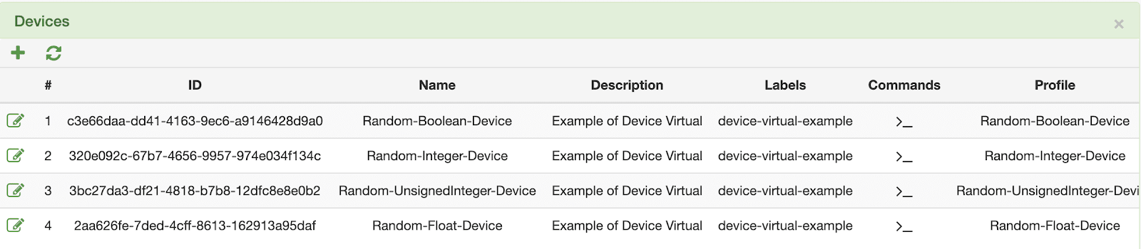 虚拟设备服务的设定是方便进行配置和调试树莓派4边缘网关。它允许在不连接实际设备的情况下进行测试。基于这种方式,边缘网关上运行的微服务在不连接物联网设备的情况下进行配置和诊断。虚拟设备服务还模拟虚拟物联网设备,这些设备会生成和传输不同类型的随机数:整数,无符号整数,布尔值和浮点数。